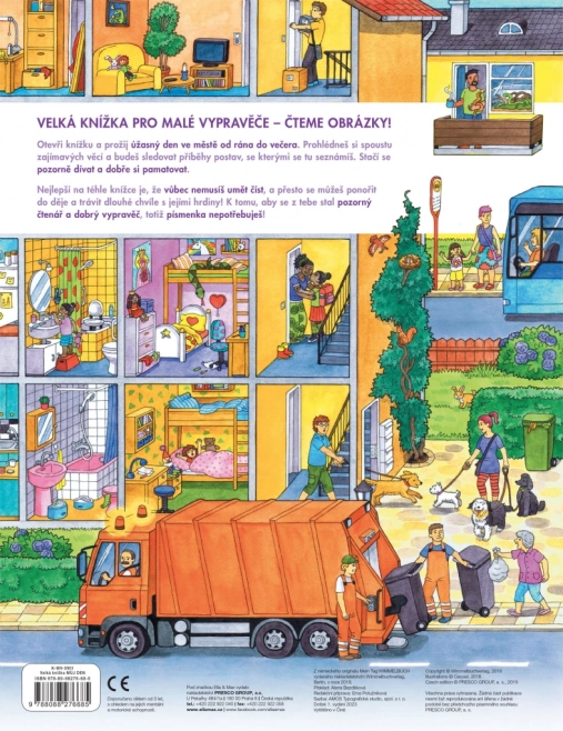 Dit grootformaat boek is ideaal om samen te lezen en te vertellen. Kinderen ontdekken wat er in de stad gebeurt van ’s morgens tot ’s avonds – van het werk van de vuilnismannen en boodschappen doen, via de peuterspeelzaal/kleuterschool, de bouwplaats, brandweer en politie, tot aan middagpret in het park en uitstapjes naar het meer of de boerderij. Elke pagina staat vol aanknopingspunten om te praten en details te zoeken.