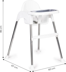 De moderne 2-in-1 kinderstoel is gemaakt van hoogwaardig materiaal. De stoel is geschikt voor kinderen van 6 tot 36 maanden. Hij kan op twee hoogtes worden gemonteerd. Voordelen van de stoel: comfortabele zitting met antislipbeveiliging, 5-punts veiligheidsgordels, stabiele antislipvoeten, praktische voetensteun, afneembaar kunststof blad. De afmetingen van de gemonteerde stoel zijn circa 86 x 67 x 60 cm. Het maximale draagvermogen is 15 kg.