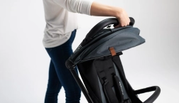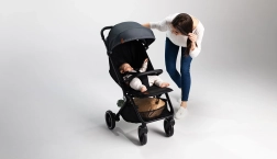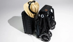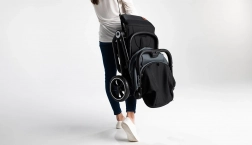 Met één druk op de knop klap je de wagen in tot een compact formaat en dankzij de draagriem neem je hem gemakkelijk over de schouder mee – ideaal voor in de stad en op reis.