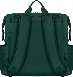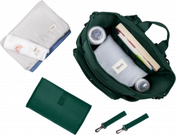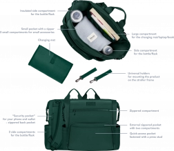 De rugzak kan op de rug worden gedragen, aan de kinderwagen worden bevestigd met behulp van afneembare universele riemen, of als losse accessoire worden gebruikt. Het verschoningsvak kan ook dienen als compartiment voor een tablet of laptop, terwijl de zij- en binnenvakken alles binnen handbereik houden. Dankzij de riemen kun je de afmeting verkleinen zodat de rugzak zelfs onder de stoel in het vliegtuig past.