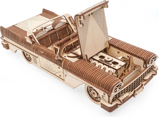 Bouw een iconische cabriolet van UGEARS en ontdek de magie van precieze houten mechanica. Het model van triplex bevat 739 onderdelen, hoge moeilijkheidsgraad en een indrukwekkend aantal functionele details: bestuurbare wielen, een opwindmotor met rijfunctie, een versnellingsbak met vrijloop en achteruit, geveerde wielophanging, werkende ruitenwissers, uitschuifbare ruitjes en neerklapbare achterbank.