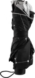 Stijlvolle opvouwbare paraplu met een zilveren buitenkant en een binnenzijde met sterrenbeeldmotief, die lichtheid, compacte afmetingen en betrouwbare bescherming tegen regen combineert. Dankzij de lengte van slechts 25 cm in opgevouwen toestand past hij gemakkelijk in een handtas of rugzak en is hij ideaal voor dagelijks gebruik.