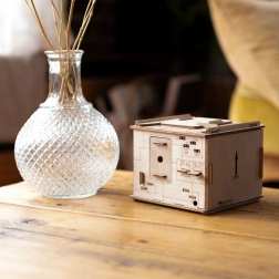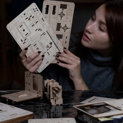 Monteer en los vervolgens dit interactieve model van berkenhout op, dat creativiteit combineert met een intellectuele uitdaging.