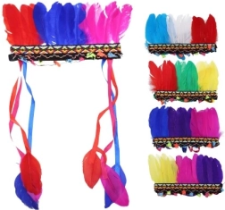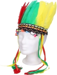 De hoofdband is versierd met gekleurde veren en decoratieve linten, waardoor het de perfecte aanvulling is voor kostuums.