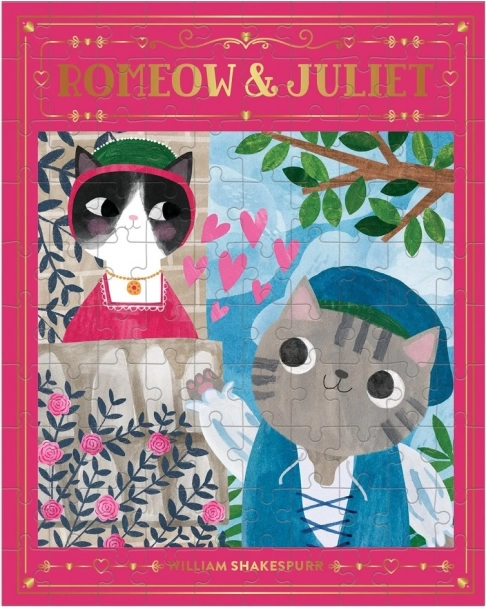 Puzzel Katten Romeow & Juliet brengt een betoverend portret van Romeo en Julia met een kattenthema. Puzzel met 100 stukjes in een boekachtige doos met gouden details en magnetische sluiting.
