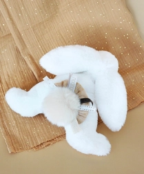Een stijlvol detail in de vorm van een beige pompon en een sjaaltje rond de hals benadrukt de moderne look van het speelgoed. Het konijntje wordt geleverd in een elegante cadeaudoos – ideaal voor een geboorte, doop of als lief cadeau voor elke gelegenheid.