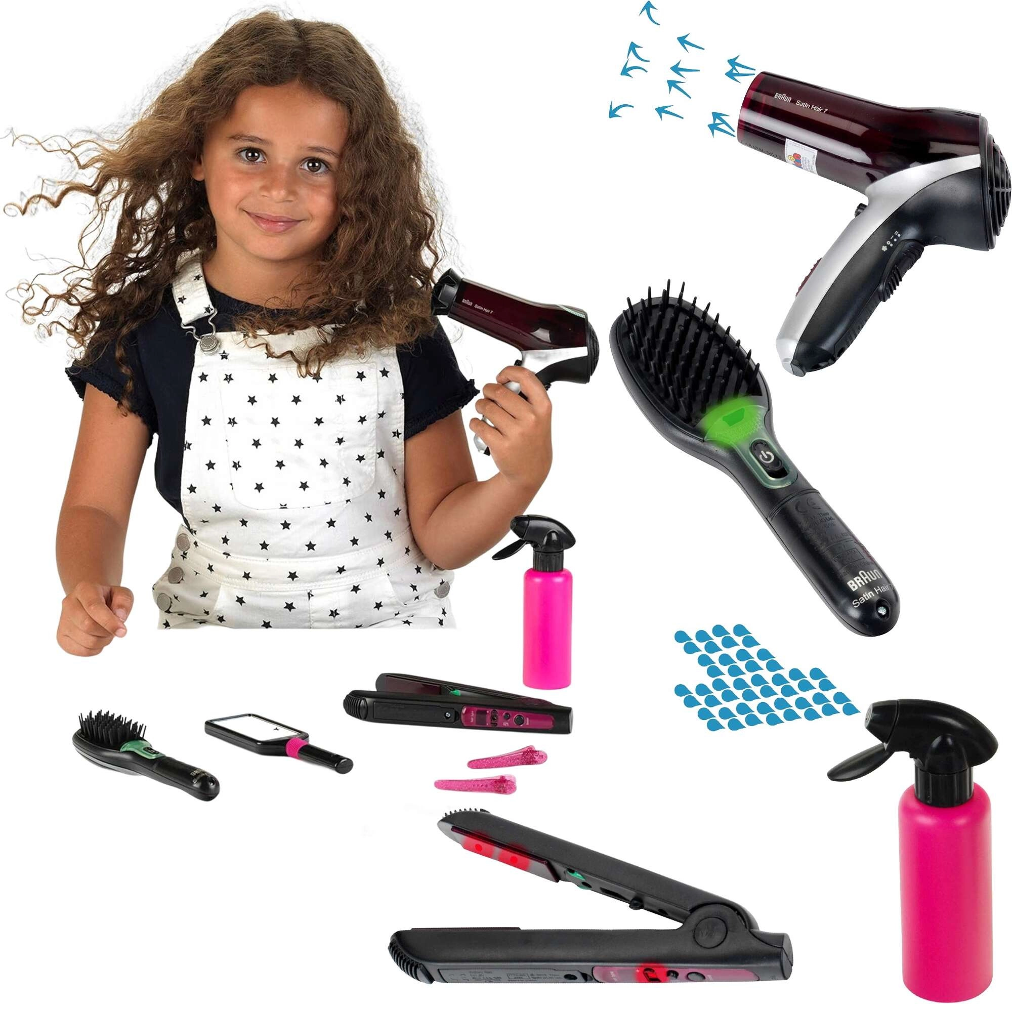 Grote kappersset geïnspireerd op de BRAUN Satin Hair-lijn, met alles wat kinderen nodig hebben voor stijlvolle kapsels. De speelgoedtools zijn ontworpen met oog voor veiligheid en imiteren echte hulpmiddelen – de föhn, stijltang en borstel werken op batterijen en zorgen voor realistische licht- en geluidseffecten, terwijl ze geen warmte of luchtstroom produceren.