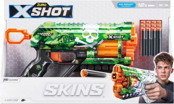 In de verpakking vind je 12 veilige schuimpijltjes die compatibel zijn met de meeste blasters. De stijlvolle camo-look en de SKINS-serie nodigen uit om te verzamelen.
