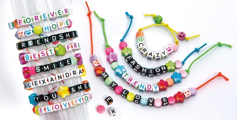 Gekke armbandjes met een bericht. Je kunt er je naam of favoriete merken op maken.