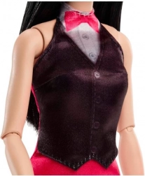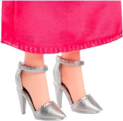 De elegante jurk en het zwarte vest geven de pop een feestelijke uitstraling, terwijl zilveren schoenen de stijl completeren.