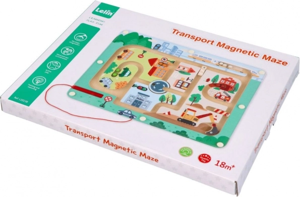 Ontdek de leuke wereld met Magnetisch labyrint Voertuigen, dat is ontworpen om de denk- en vaardigheidsontwikkeling van kleine handen te stimuleren. Dit speelgoed is gemaakt van hoogwaardig hout en toont een kleurrijke stadsscène met wegen, gebouwen en voertuigen. Met behulp van de rode magnetische staaf begeleiden kinderen kleine balletjes langs het pad, wat hun fijne motoriek en oog-handcoördinatie bevordert.
