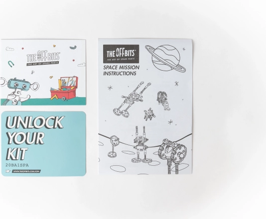 Creatieve bouwset The OffBits Ruimtemissie: 150+ onderdelen, gereedschap inbegrepen, 3 modellen en eindeloze mogelijkheden. Ontwikkelt creativiteit en STEAM-vaardigheden vanaf 8 jaar.