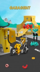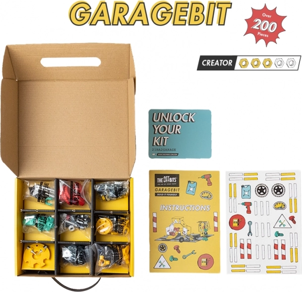 Houd je voertuigen in topconditie met GarageBit, dat kleurrijke moeren, bouten, gevormde onderdelen en stickers bevat. Deze set is niet slechts een onderdeel van het spel, maar wordt een volledig functionerende garage, tankstation en werkplaats. Ontwikkel je creativiteit en verbeelding door drie modellen en nog veel meer volgens je eigen ideeën te maken.