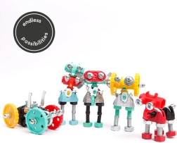 Met dit bouwpakket is het geen probleem om robots, auto's of ongewone uitvindingen te maken. U kunt uw fantasie inzetten en verschillende recyclebare materialen zoals karton of schroeven gebruiken.