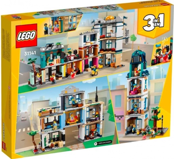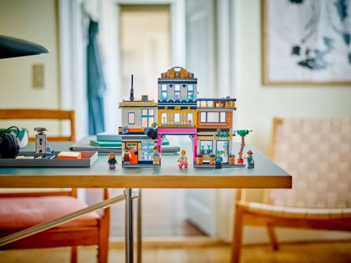 Lego Creator Hoofdstraat biedt drie bouwmogelijkheden in één doos. Bouw een hoofdstraat met vier gebouwen, transformeer deze in een vierlaagse art-decoappartementswoning met een park, of in een winkelstraat met studio en bloemenwinkel. De set bevat zes minifiguren voor speelse verhalen.