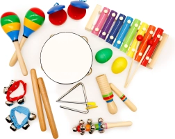 Van tamboerijn en triangeltje tot maracas en belletjes – de gevarieerde samenstelling wekt nieuwsgierigheid en ondersteunt de eerste muzikale stapjes.