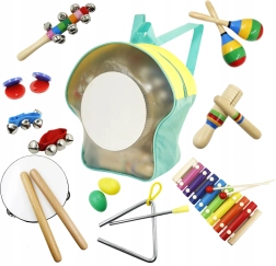 De set is ontworpen met focus op veiligheid en duurzaamheid. Elk stuk heeft gladde randen en is aangepast aan kinderhanden. De praktische, transparante rugzak houdt alle instrumenten bij elkaar en maakt het mogelijk ze overal mee naartoe te nemen – op bezoek, naar de kleuterschool of naar een optreden.