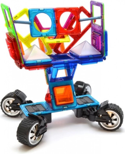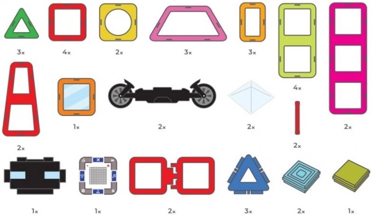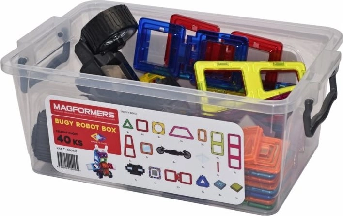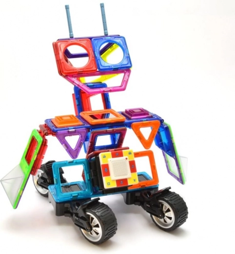 De box is ideaal voor het bouwen van rijdende robots met vrij verstelbare armen, maar ook motorfietsen, trucks en aanhangers. Drie driehoekige opzetstukken en een rijke set rechthoeken helpen stevige frames in hoogte en lengte te creëren. Kinderen oefenen met magnetische verbindingen en ontwikkelen fantasie, ruimtelijk inzicht en fijne motoriek. De onderdelen zijn veilig, duurzaam en compatibel met GEOMAG.