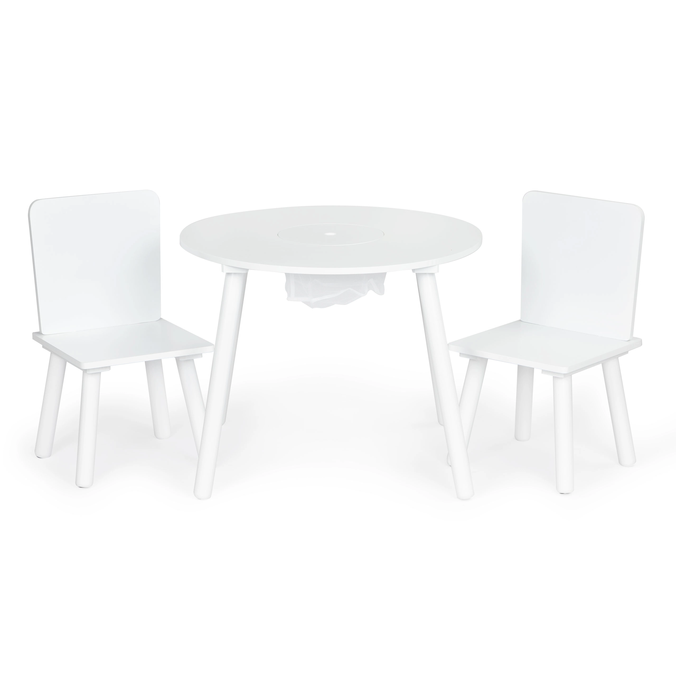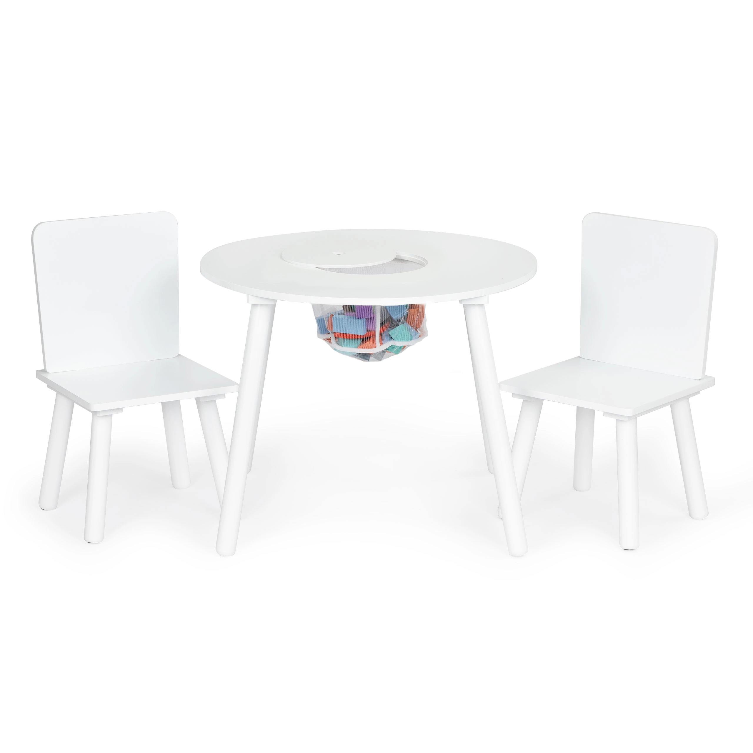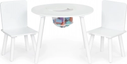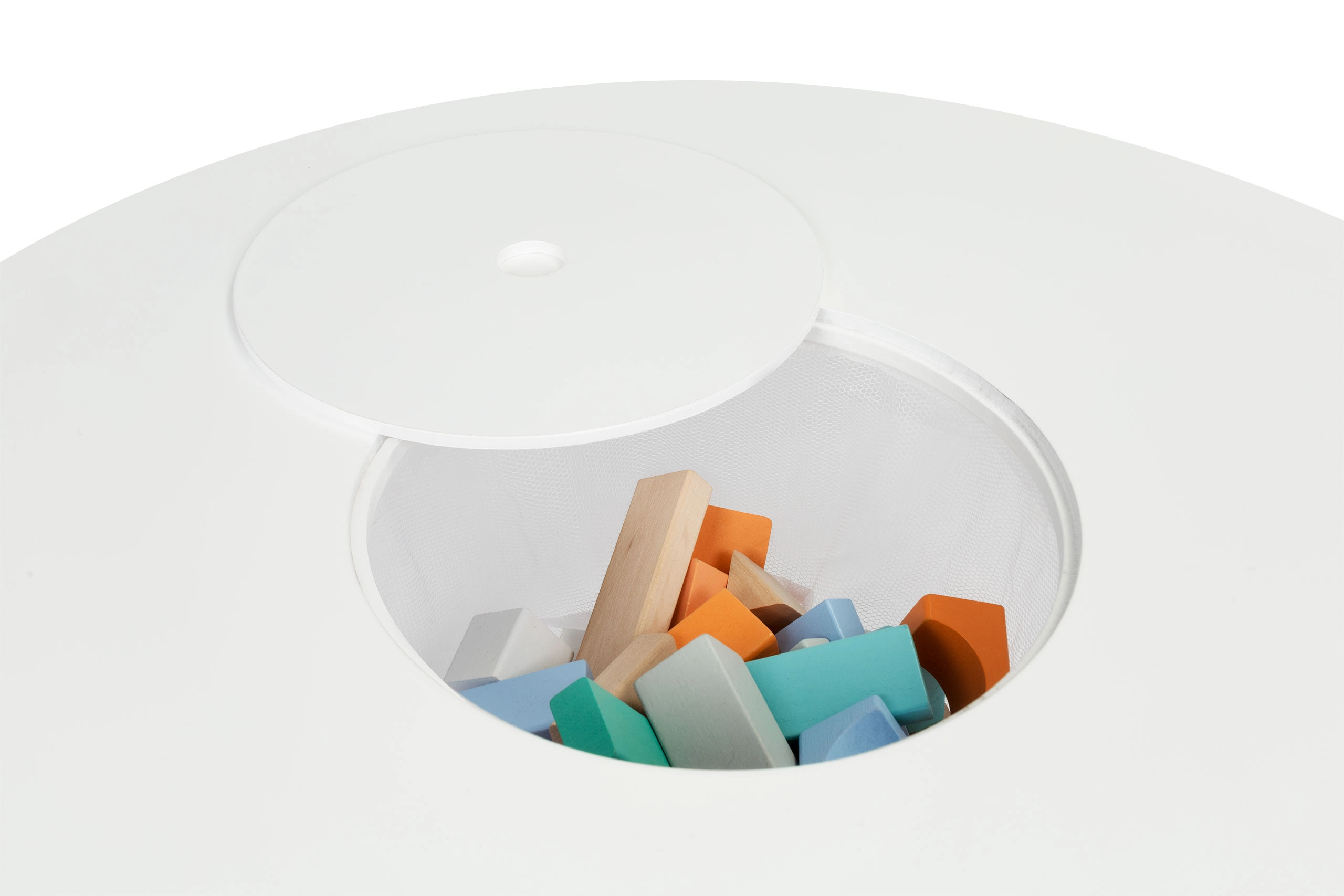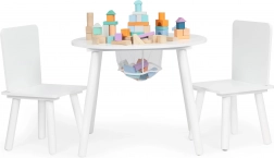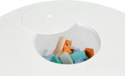 Het praktische opklapbare deksel in het midden verbergt een netmand waarin kinderen blokken, potloden of klein speelgoed in een handomdraai kunnen opbergen. De set past perfect in moderne interieurs in Scandinavische stijl en is ideaal voor kinderkamers, speelruimtes en wachtruimtes.