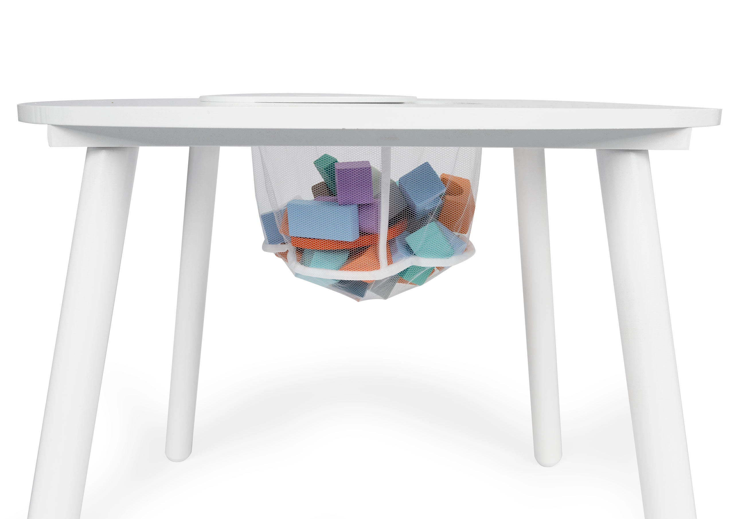 Het opklapbare middenstuk onthult een praktisch netmandje – perfect voor blokken, potloden en klein speelgoed. Opruimen kost slechts enkele seconden en het werkblad blijft netjes.
