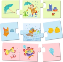 Puzzle Trio Mijn dag van het merk DJECO is ideaal voor de eerste puzzelervaringen. Kinderen verbinden trio’s met afbeeldingen die thematisch bij elkaar horen en spelen zo dagelijkse activiteiten na. Van het opstaan in de ochtend tot het slapengaan in de avond – elke set van drie vormt een eenvoudig verhaaltje.