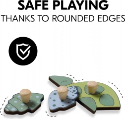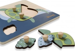 De houten puzzel met knopjes Turtle is ontworpen voor kleine kinderhandjes. Elk stukje heeft een houten knopje voor eenvoudige grip en nauwkeurig plaatsen. Door te puzzelen traint je kind de fijne motoriek, oog-handcoördinatie, het geheugen en de waarneming van vormen en kleuren. Afgeronde randen zorgen voor veilig spelen vanaf 12 maanden.