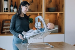 Doordachte details zoals de afneembare speelboog met speeltjes voor de ontwikkeling van motoriek en verbeelding, de 3-punts gordel voor zekerheid bij het zitten en de gemakkelijk te onderhouden wasbare hoes maken deze wipstoel tot een praktische keuze voor elk huishouden.