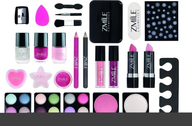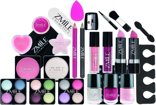 - Complete set: oogschaduw, nagellak, oog- en lippotloden, lipgloss, lipsticks, applicators, spiegeltje