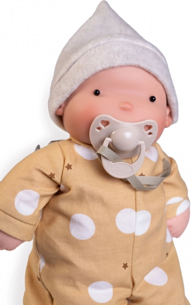 Hoofd van 100% siliconen, vulling van gerecyclede PET-vezels en kleding van bio-katoen zonder chemische behandeling.
