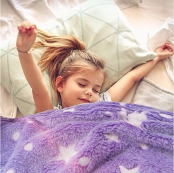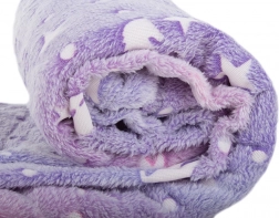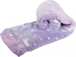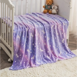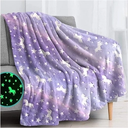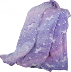 Geniet van maximaal comfort met een superzachte deken in een elegante paarse kleur met eenhoorns en sterretjes. Dankzij speciale vezels lichten de motieven in het donker op, waardoor de deken perfect is voor de kinderkamer en voor ontspannen avonden. Ze is zacht, warm, dubbelzijdig en machinewasbaar.