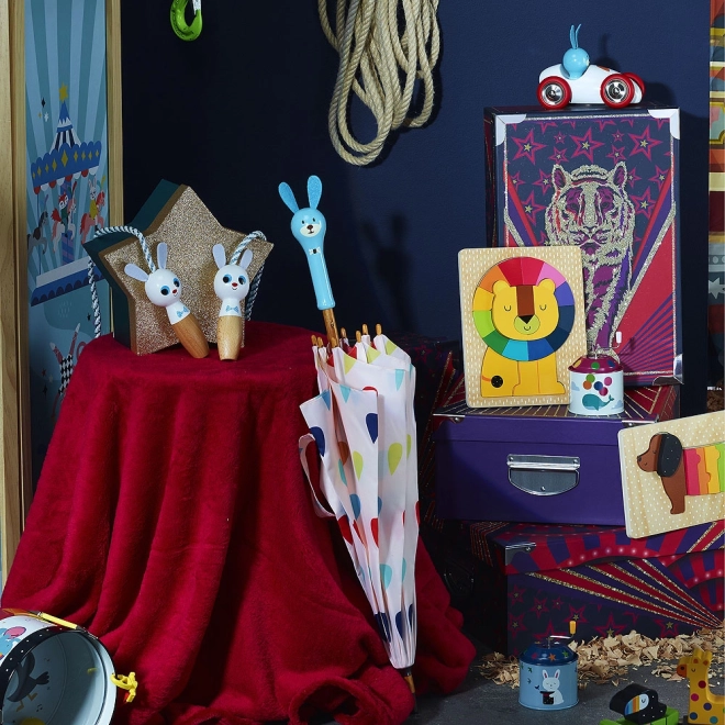 Schattige kinderparaplu met het figuurtje van konijn Raoul van het merk VILAC, met een gelakt houten handvat in de vorm van een diertje en een stevige metalen constructie. Ideaal voor regenachtige dagen, ligt goed in kinderhanden en gaat dankzij de hoogwaardige afwerking dagelijks gebruik moeiteloos mee. Onderdeel van de Boizoos-collectie – een perfect cadeau voor de allerkleinsten.