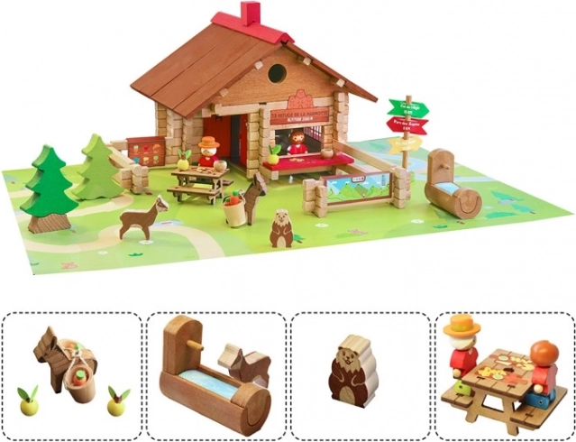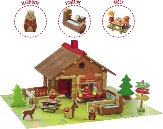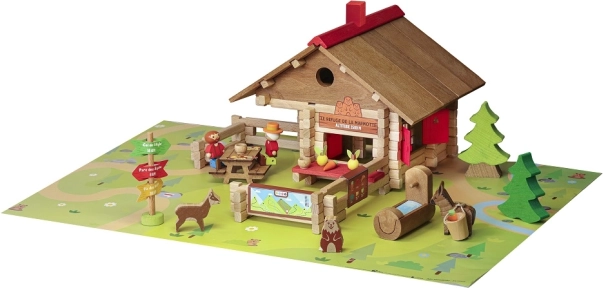 Deze authentieke houten bouwset uit de Jeujura-serie brengt kinderen in de wereld van berghutten en dierenvrienden. Onderdelen van massief beuken- en grenenhout van Franse herkomst passen eenvoudig in elkaar en maken het mogelijk stabiele huisjes met realistische details te bouwen. Inclusief thematische accessoires – een picknicktafel, fontein en figuren (bijv. ezel, gems en marmot) die de fantasie en rollenspel stimuleren.