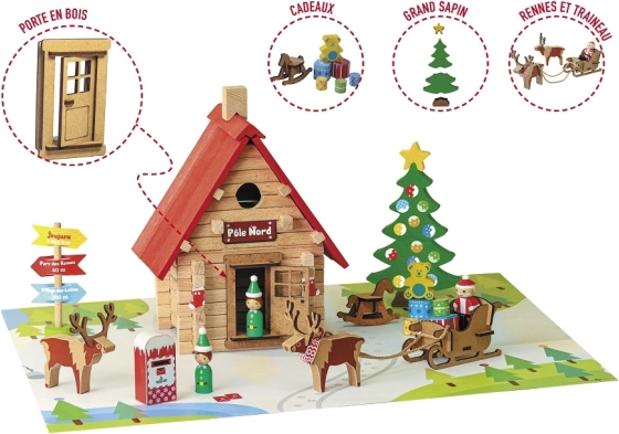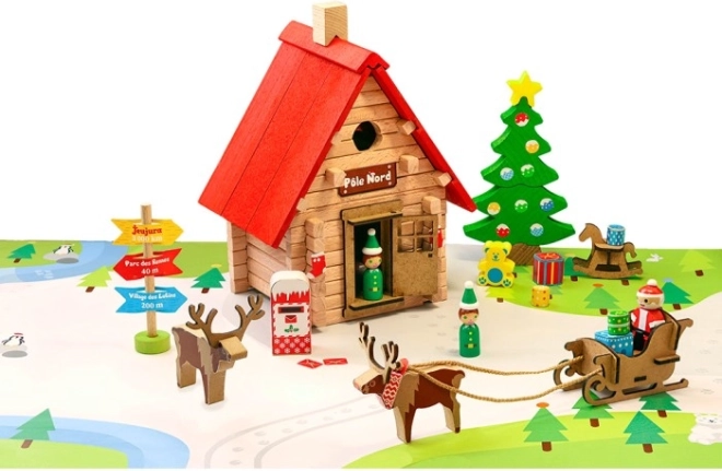 Deze themaset brengt de sfeer van de Noordpool rechtstreeks naar de kinderkamer. Bouw Santa’s chalet, plaats de elf-figuurtjes, span de rendieren voor de slee en versier de scène met een kerstboom met cadeautjes. Dankzij de precieze houten onderdelen is bouwen leuk en stimuleert het de fijne motoriek, het geduld en de creativiteit.