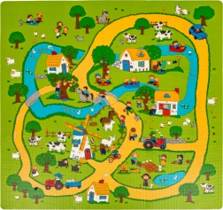 Ontdek de speelse schuimmat met het thema leven op het platteland, die een veilige en stimulerende speelruimte voor je kind creëert. Je zet er een vierkant speelveld mee in elkaar met wegen, vijvers, bomen, gebouwen, een windmolen, dieren, voertuigen en figuurtjes – perfect decor voor spel met speelfiguren.