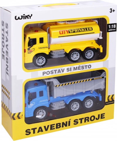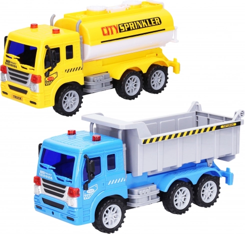 Set van twee vrachtwagens met verkeersborden, 25 cm, met frictiemotor. Tsjechische verpakking, plezier en het leren van verkeersregels in één.