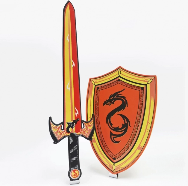 Deze kinderset bevat een schuimzwaard en een schild met een aantrekkelijk drakenmotief. De lichte schuimconstructie bevordert veilig spelen zonder risico op letsel en is geschikt voor kinderen die houden van ridderavonturen, samoeraigames en verkleedpret.