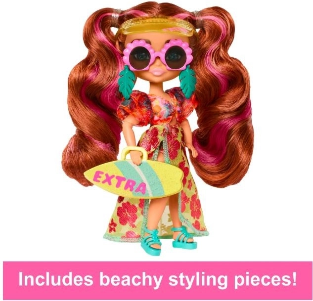 Strandaccessoires geven elk spel extra flair – zonnebrillen in de vorm van roze schelpen, een stijlvolle sjaal-haarband en een pet met klep die matchen met de handtas die aan een surfplank doet denken. De meegeleverde standaard laat je de pop stabiel neerzetten en verzamel-scenes creëren.