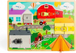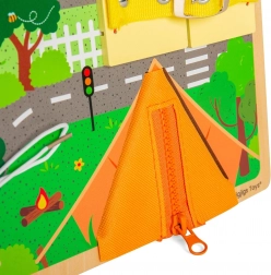 Elk functioneel detail verbergt illustratieve scènes die motiveren om verder te ontdekken en rollenspel te stimuleren. Dankzij de stevige houten afwerking met FSC-certificering is het bord duurzaam, milieuvriendelijk en geschikt voor dagelijks gebruik thuis en in de kinderopvang.