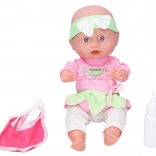 Schattige baby met kinderwagen, ideaal voor kinderspel en het ontdekken van de fantasiewereld. Het pakket bevat een opvouwbare kinderwagen, een slabbetje, en een flesje voor een complete speelervaring.