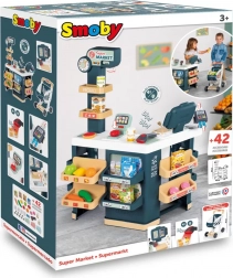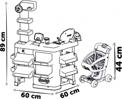 Supermarkt met kassa, groente-/fruitafdeling en weegschaal (nieuwe mechanische weegschaal: het weergegeven gewicht past zich aan de gewogen voedingsmiddelen aan). Het kind kan de klok en het open-/geslotenbord instellen. Bevat 42 accessoires: pasta, koekjes, ontbijtgranen, melk, 6 stuks fruit en groente, 1 taart, 2 macarons, 2 blikjes, 1 elektronische barcodescanner met geluid en licht, 1 creditcard, 4 bonnetjes, 9 munten en 12 bankbiljetten. De kassa heeft een geldlade, microfoon en kaartlezer. Winkelwagentje inbegrepen.