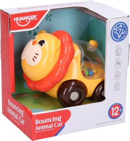 Rammelaar leeuw op wieltjes voor kinderen vanaf 12 maanden. Rammelt tijdens het rijden, ontwikkelt motoriek en zintuigen. Compacte afmetingen 8,3×10,5×8,5 cm.
