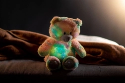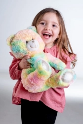 De beer is niet alleen heerlijk zacht om aan te raken, maar verlicht ook de duisternis met zijn veranderende kleuren, wat een magische sfeer creëert. Door de poot in te drukken begint ontspannende melodieën te spelen, die elk kind kalmeren.