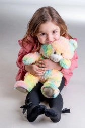 Het gevulde dier heeft een regenboogvacht, vangt de blik en is indrukwekkend, niet alleen door het uiterlijk, maar ook door de zachtheid bij aanraking.