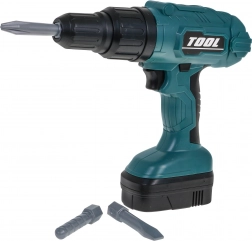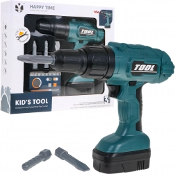 Inclusief drie opzetstukken: boor, platte bit en kruiskopbit. Kinderen leren eenvoudig opzetstukken wisselen en verschillende taken uitproberen zoals echte vaklui.