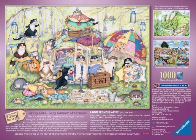 Geniet van rustige momenten met een puzzel van 1000 stukjes uit de serie CRAZY CATS. Het motief „Luie zomermiddag” zal katten- én humorliefhebbers bekoren en vormt na het leggen een afbeelding van ca. 70 × 50 cm met hoogwaardige afwerking en precies passende stukjes.