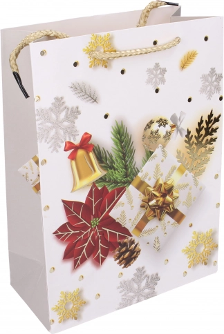Stijlvol cadeautasje in maat S met afmetingen 18 × 24 × 8,5 cm, ideaal voor het verpakken van kleinere cadeaus. Biedt kerstmotieven, stevige uitvoering en comfortabel dragen dankzij de praktische handgrepen.