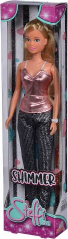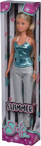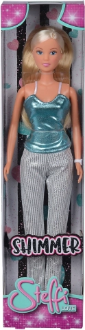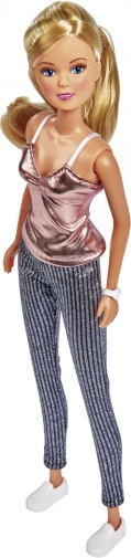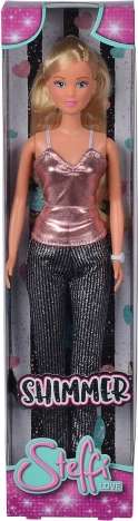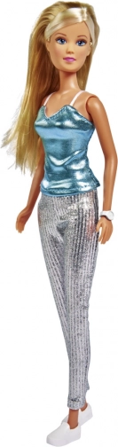 De stijlvolle pop STEFFI LOVE Shimmer in een moderne sportief‑chique outfit zal alle kleine modeliefhebbers blij maken. Ze draagt een glinsterende top, glanzende broek, witte sportsneakers en een horloge als accessoire. Er zijn 2 varianten beschikbaar, het product wordt willekeurig verzonden.