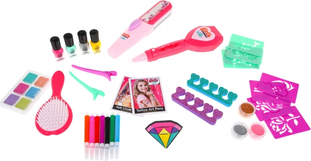 Prachtige 3-in-1 set voor meisjes is ideaal voor creatieve styling van gekleurd haar, manicure en tatoeages. Deze set combineert veilige en niet-giftige cosmetische hulpmiddelen die je na het spelen eenvoudig verwijdert.