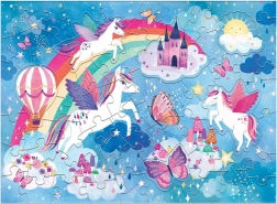Een kleurrijke illustratie met eenhoorns, een regenboog en vlinders nodigt uit tot puzzelen en stimuleert de verbeelding en het geduld.