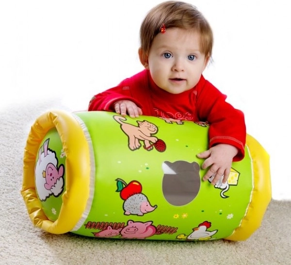 Een leuke en veilige opblaasbare rol voor de allerkleinsten die kruipen, stabiliteit en de eerste pogingen tot rechtop staan ondersteunt. Binnenin zitten drie belletjes die bij beweging zacht rinkelen en het kind tot activiteit motiveren. Het product is ftalaatvrij en gecertificeerd, geschikt vanaf 6 maanden.